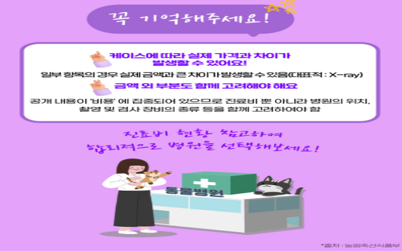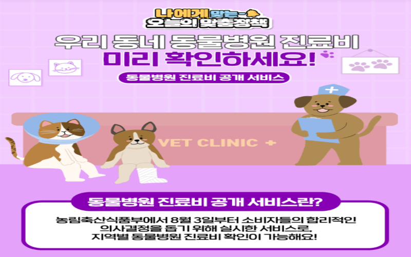 : 동물병원 진료비 공개 서비스는 '농림축산식품부'에서 '23년 8월 3일부터 실시한 서비스로, 반려동물 보호자들이 병원마다 다른 진료비 정보를 쉽게 비교해서 합리적인 선택을 할 수 있도록 도와주는 서비스입니다. 우리나라에서는 아직 생소하지만 해외에서는 이미 보편화 되어 있는 서비스라고 합니다.
