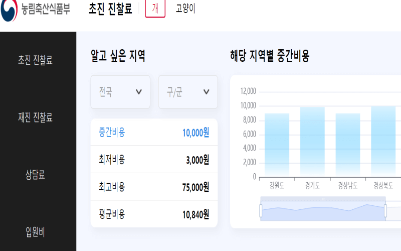 : 진료비 확인은 농림축산식품부에서 운영하는 아래 사이트로 접속하여 확인하시면 됩니다. 진료비 공개 항목당 최저비용과 최고비용을 동시에 제공하기 때문에 내가 사는 지역에서의 대략적인 시세를 파악할 수 있습니다.