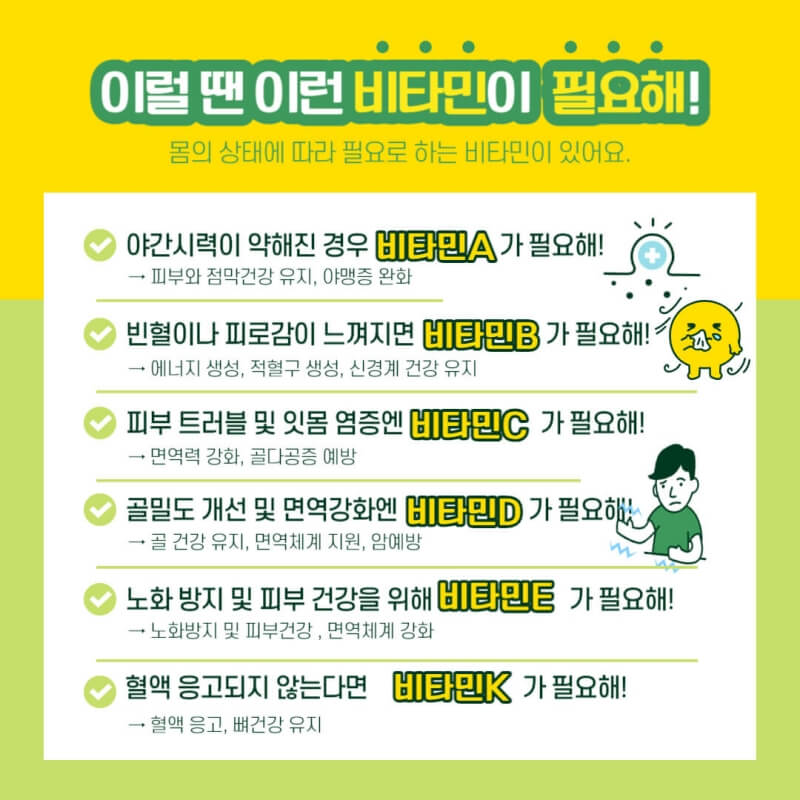 본인의 몸에 필요한 비타민을 충분히 먹어 건강한 삶을 유지하시기 바랍니다.