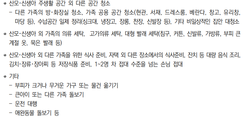 o 단, 산모·신생아 외 다른 가족 돌봄이나 일반 가사 활동 영역은 표준서비스에 포함되지 않으며,