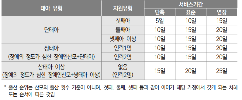 o 바우처 지원 기간은 태아 유형, 출산 순위, 서비스 기간 선택 등에 따라 최단 5일에서 최장 25일까지 차등화됩니다.